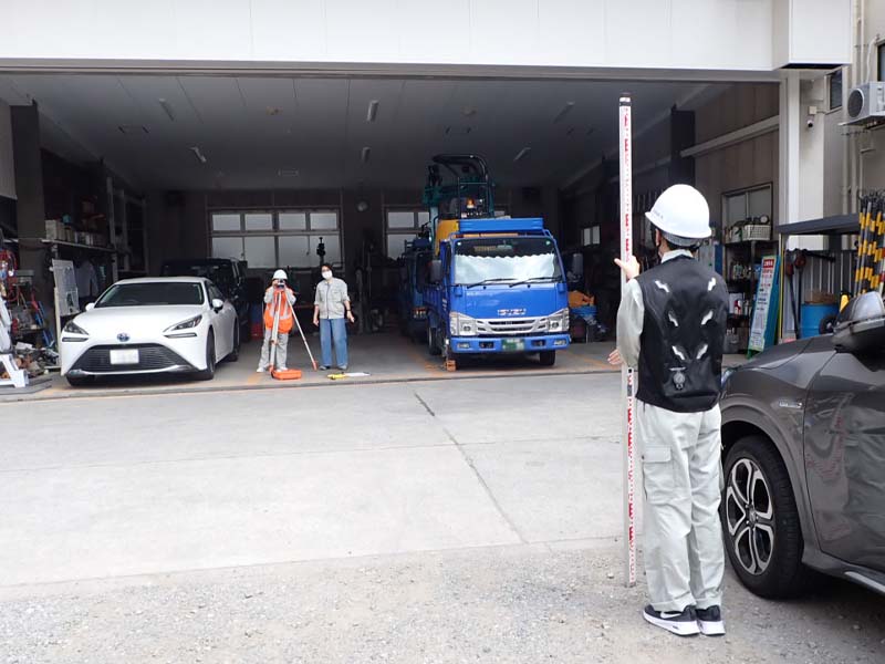 お昼休憩を挟んで午後からは、会社敷地内で測量の体験を行っていただきました。