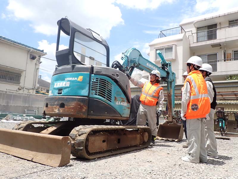 普段はダンプに乗せて現場へ運んでいるバックホウ(ショベルカー)を下して間近で見ることができました。